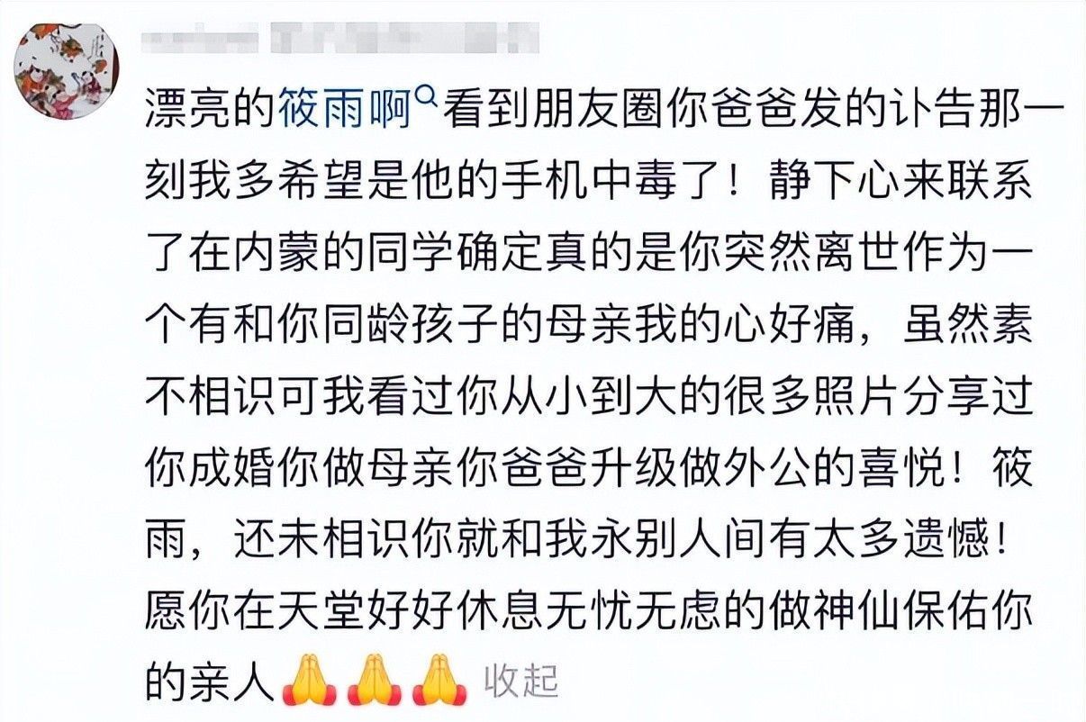 就在母亲疾驰向医院的路上,女婿发来消息:筱雨经两小时全力抢救,仍未能苏醒。