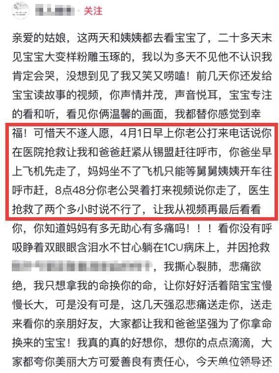 4月4日,悲恸难抑的母亲公开发文,还原事实:女儿于4月1日凌晨突发心脏骤停,抢救无效离世。